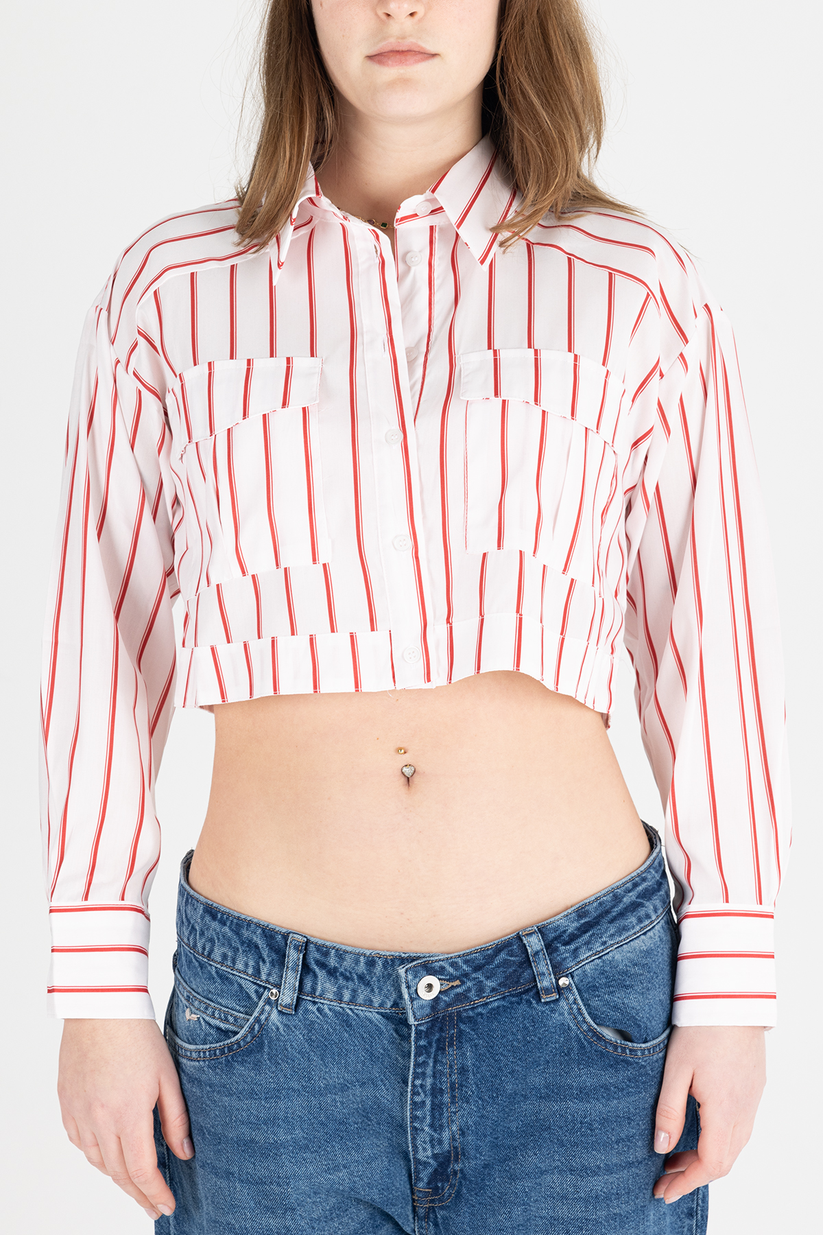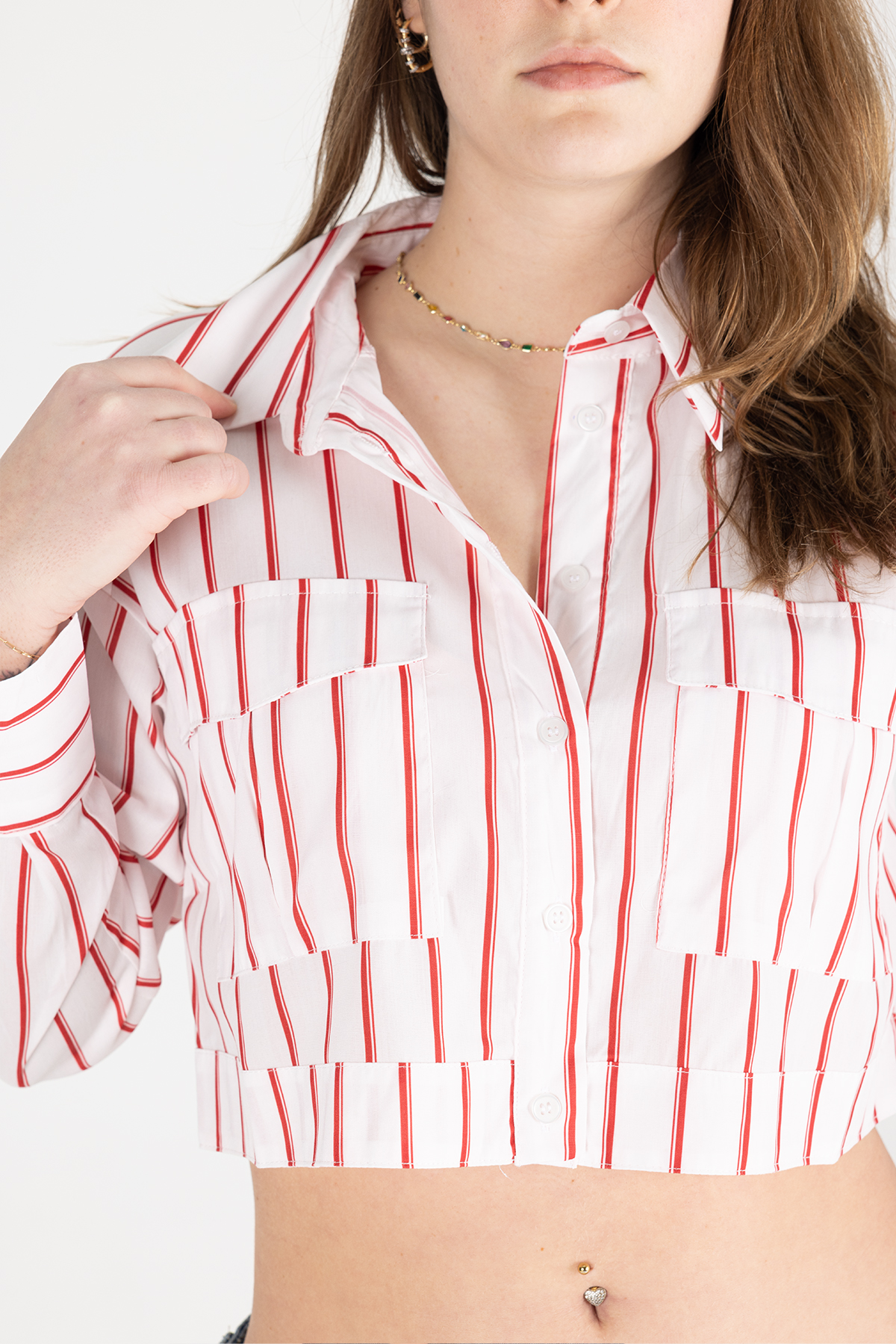 Paylen Kırmızı Beyaz Çizgili Crop Gömlek