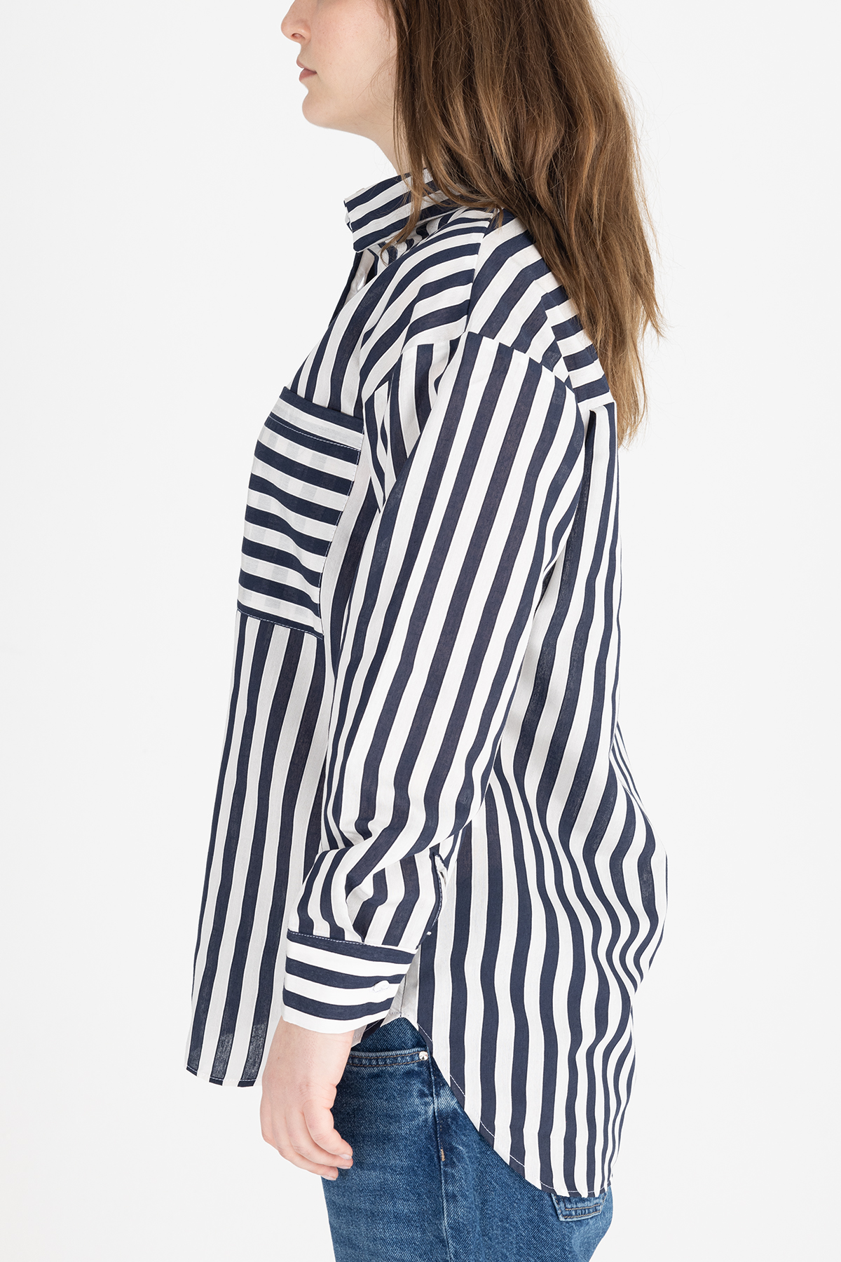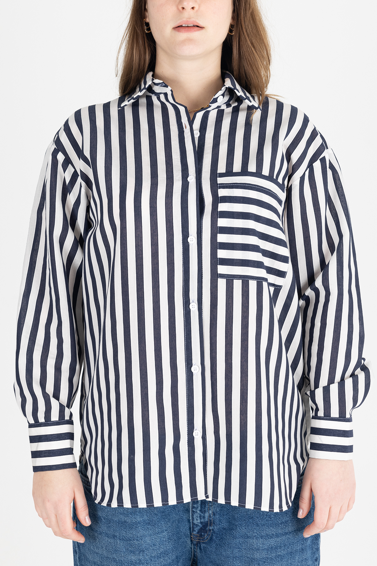 Paylen Lacivert Beyaz Çizgili Oversize Gömlek