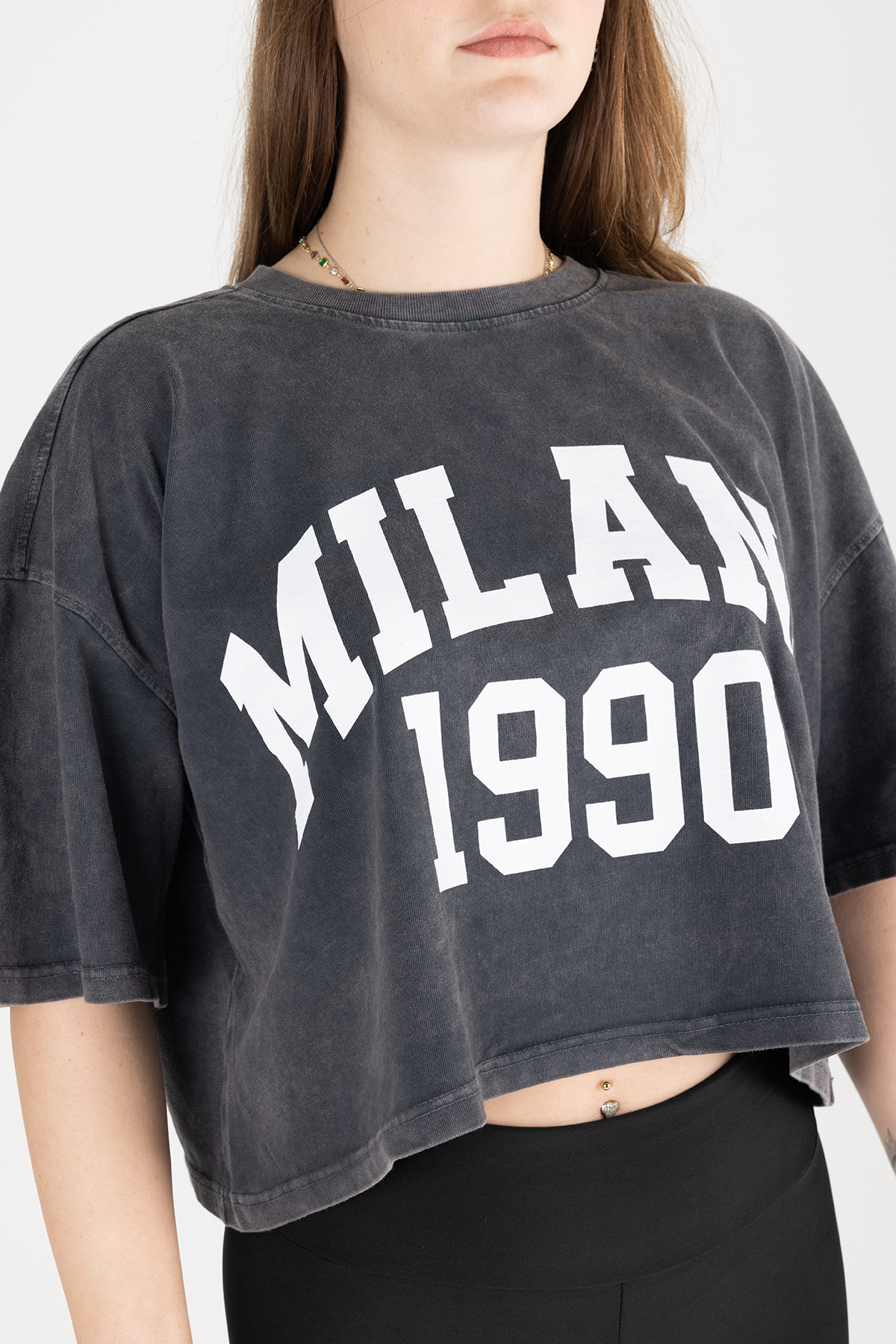 Paylen Milano 1990 Yazılı Yıkamalı Gri Crop T-Shirt