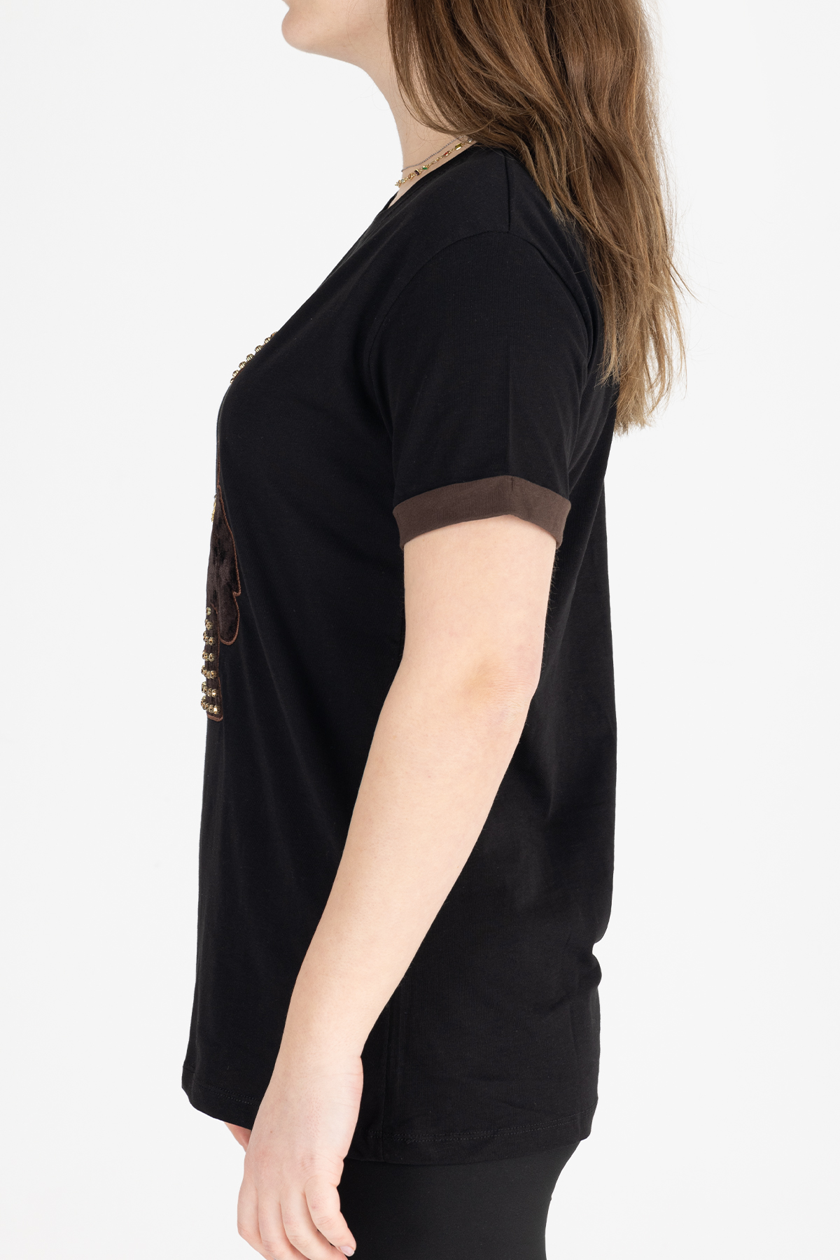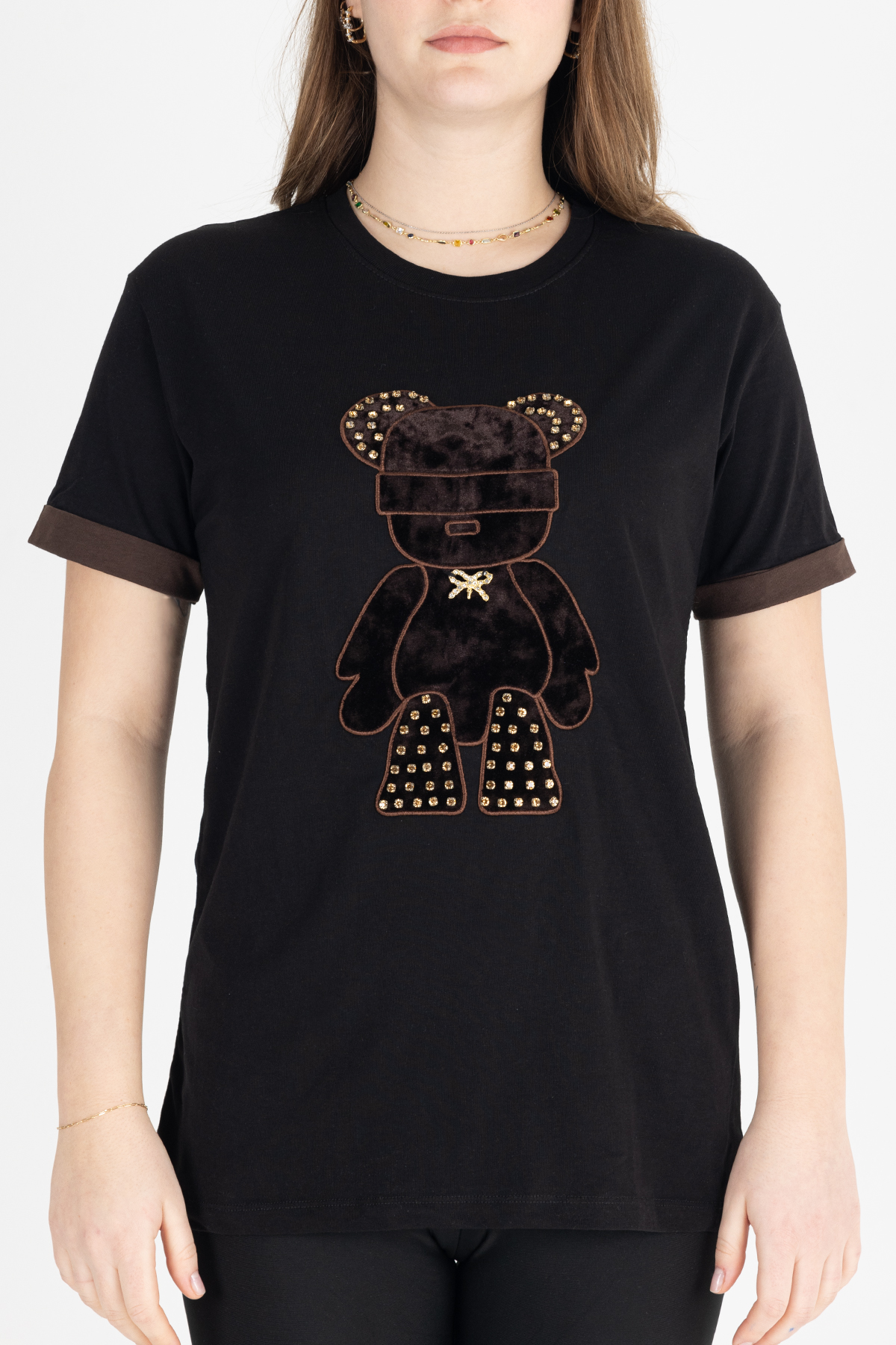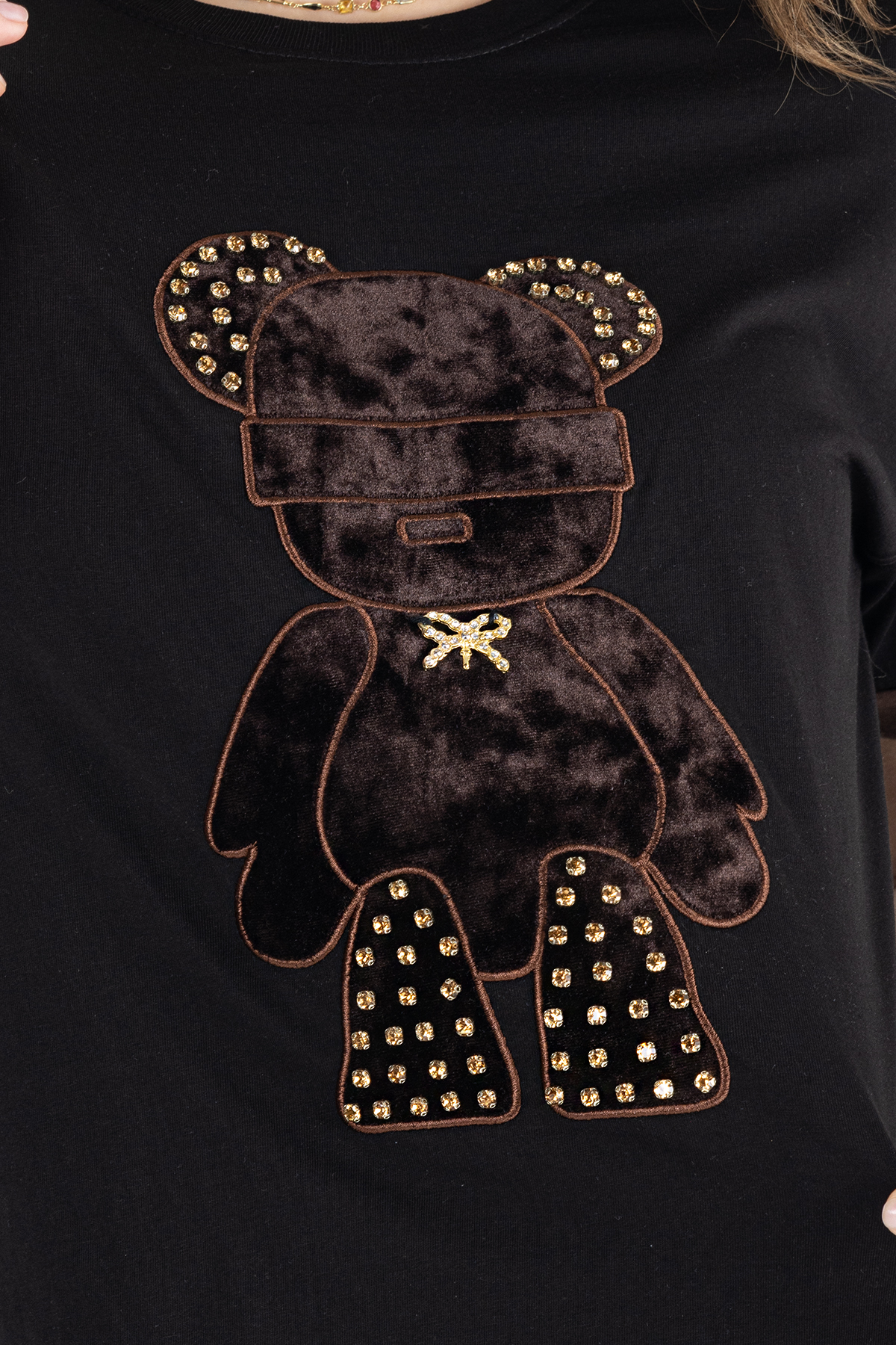 Paylen Siyah Kadife Detaylı Taşlı Ayıcık Baskılı T-Shirt