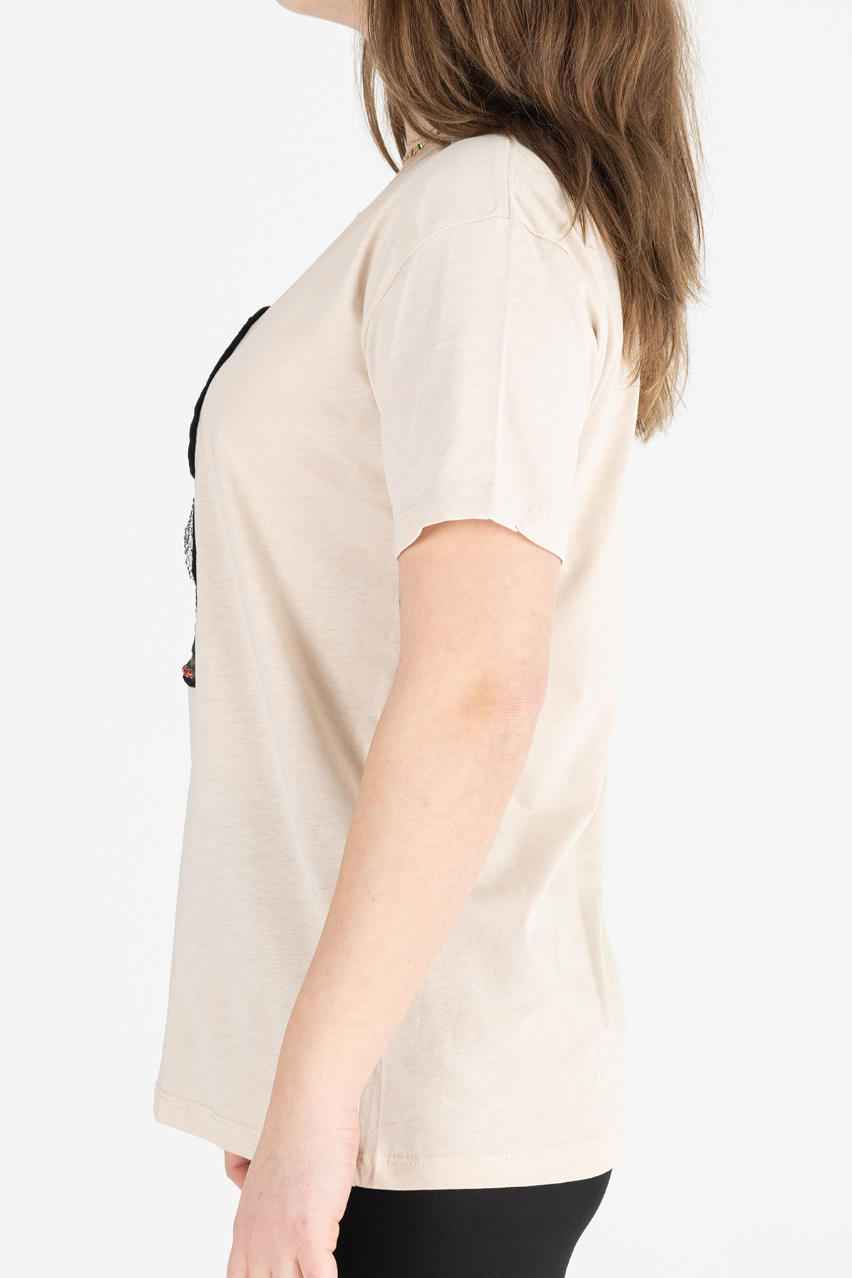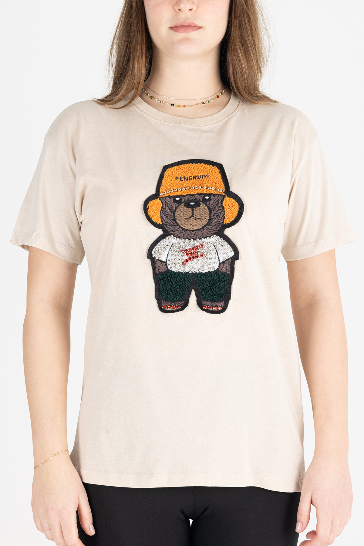 Paylen Taş İşlemeli Ayıcık Nakışlı Bej T-Shirt