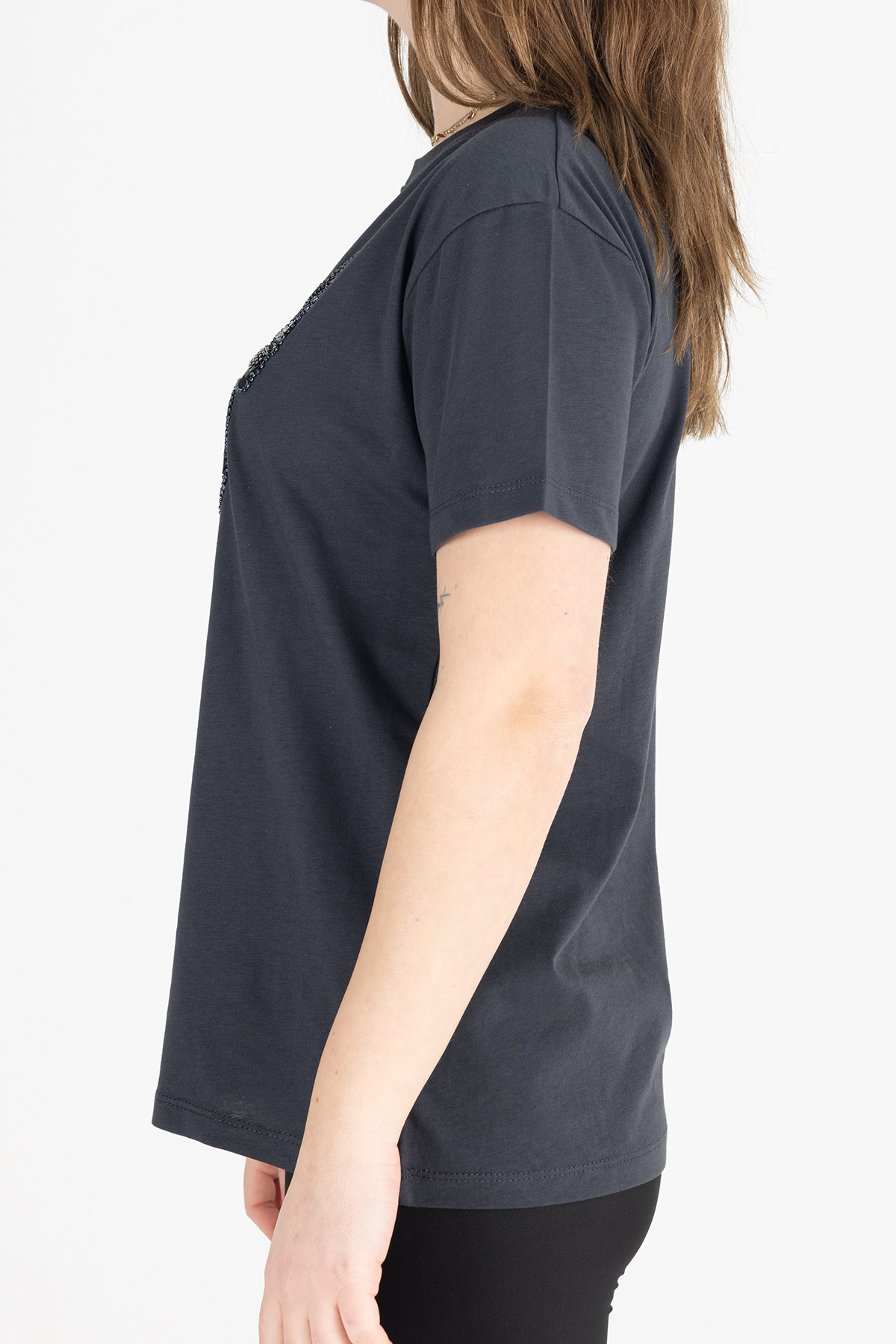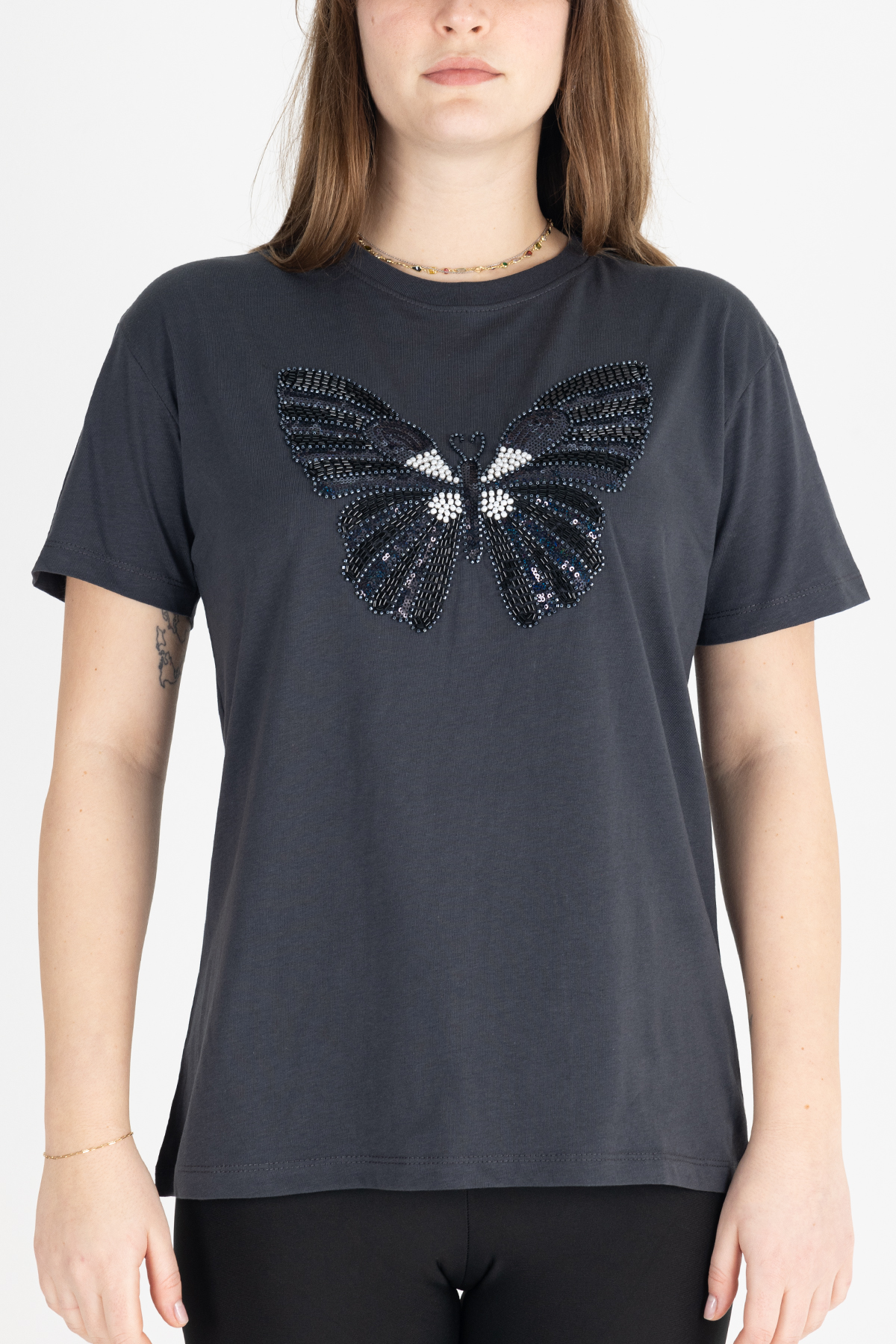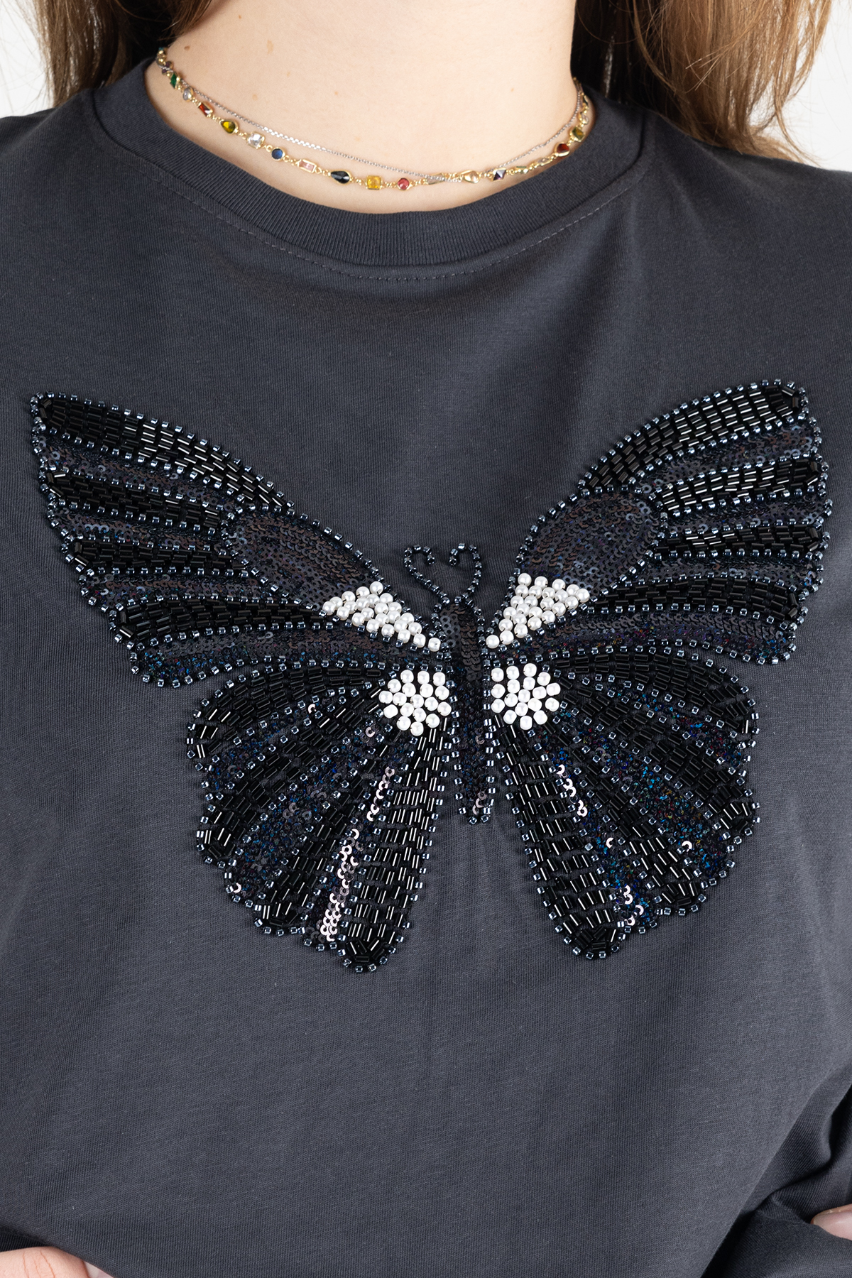 Paylen Taş İşlemeli Kelebek Koyu Gri T-Shirt