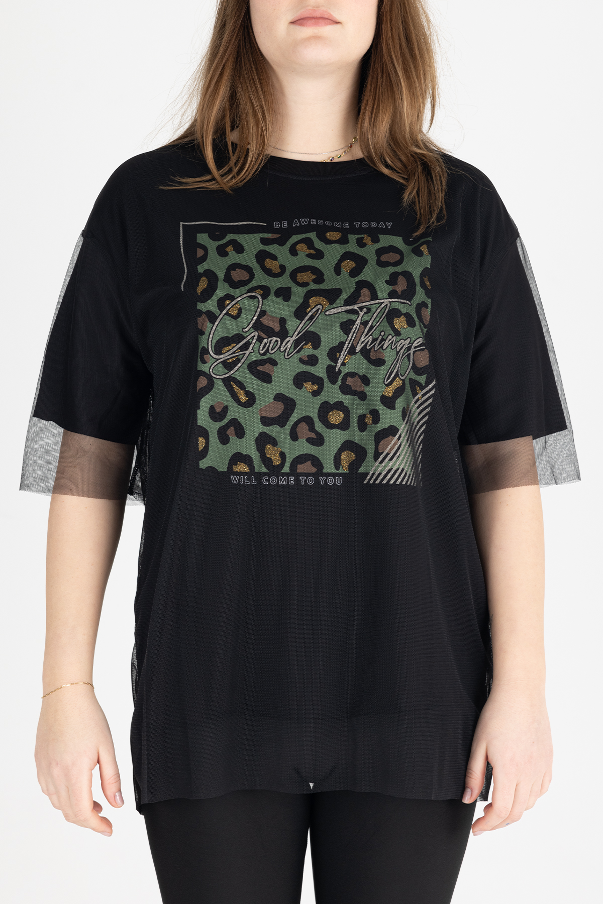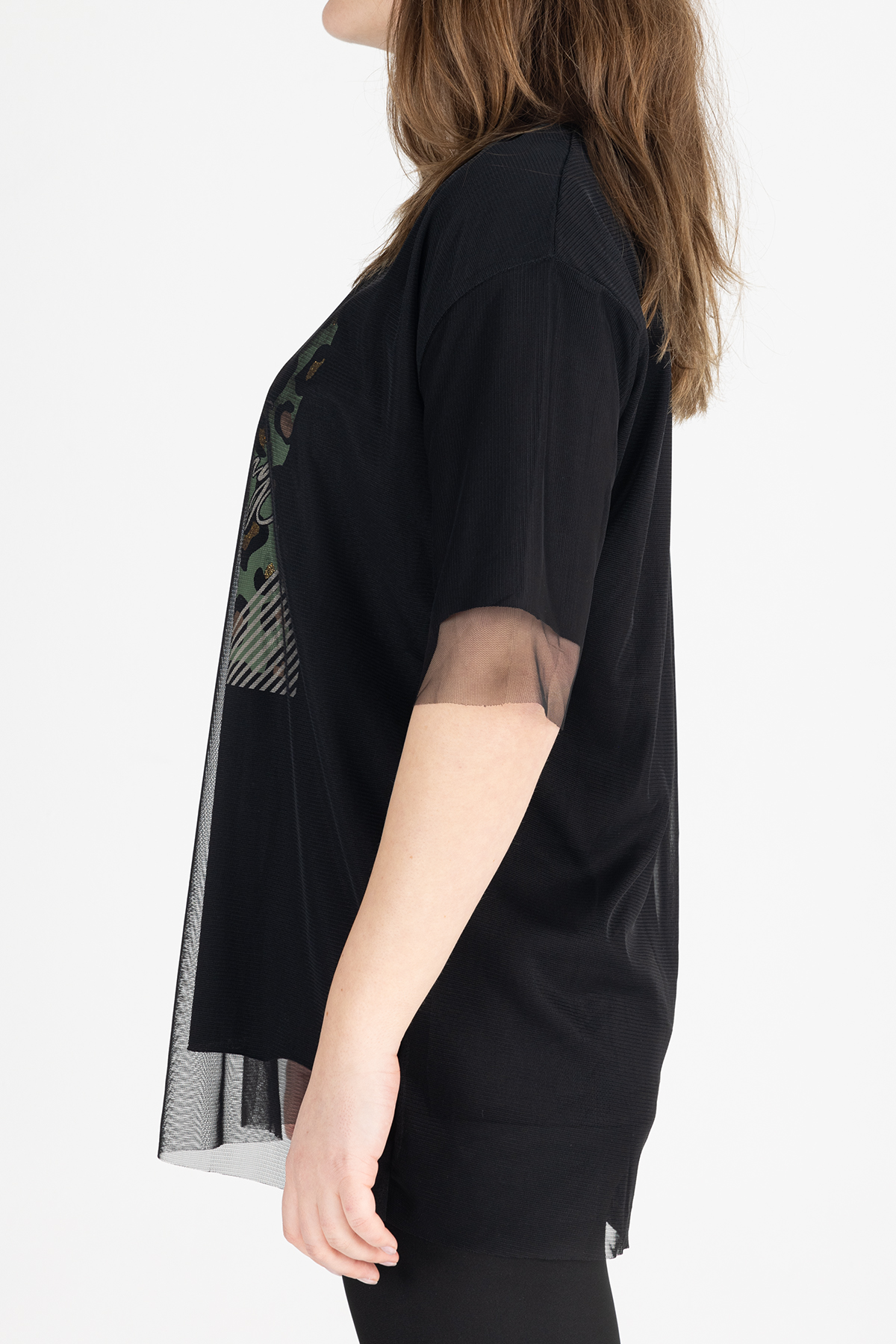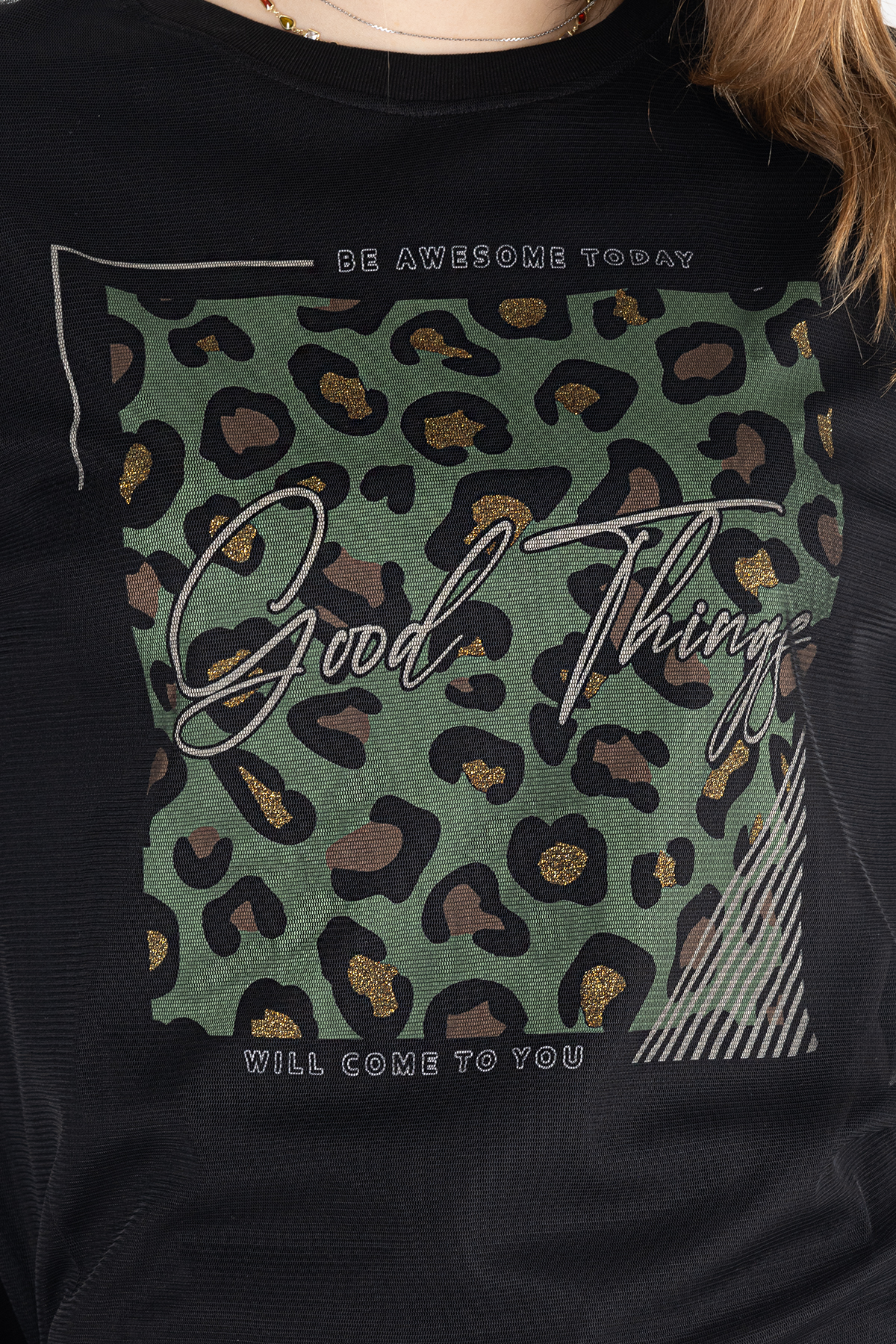 Paylen Tüllü Detaylı Siyah Leopar Baskılı T-Shirt