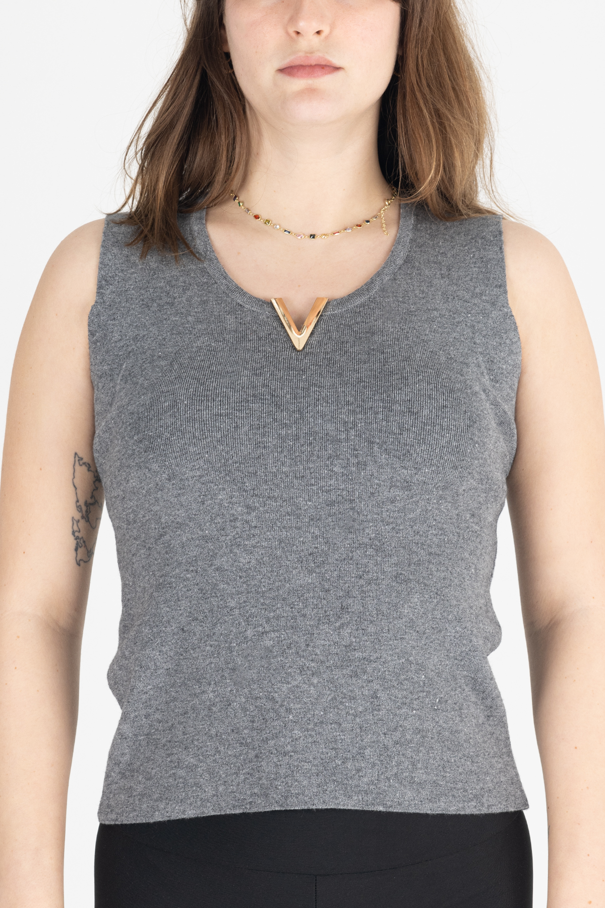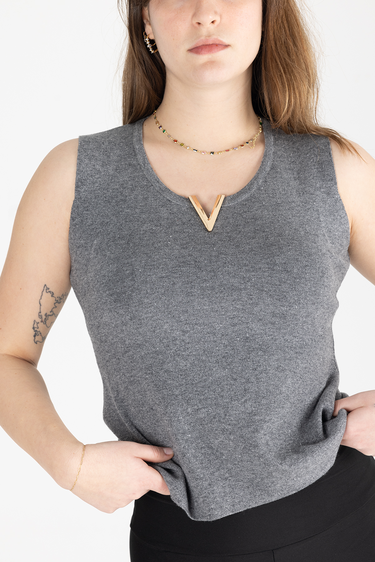 V yaka ve metalik aksesuar detayı