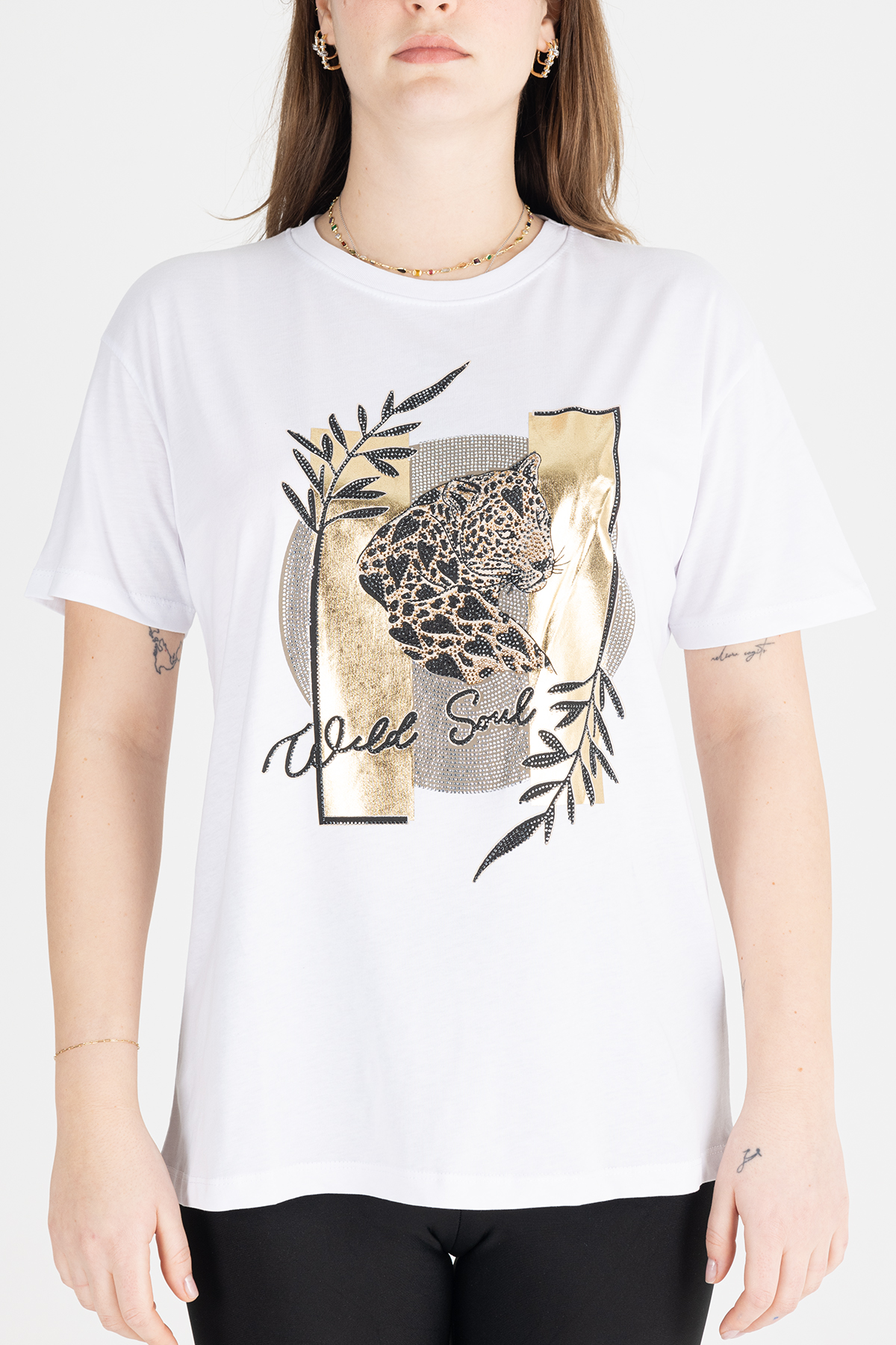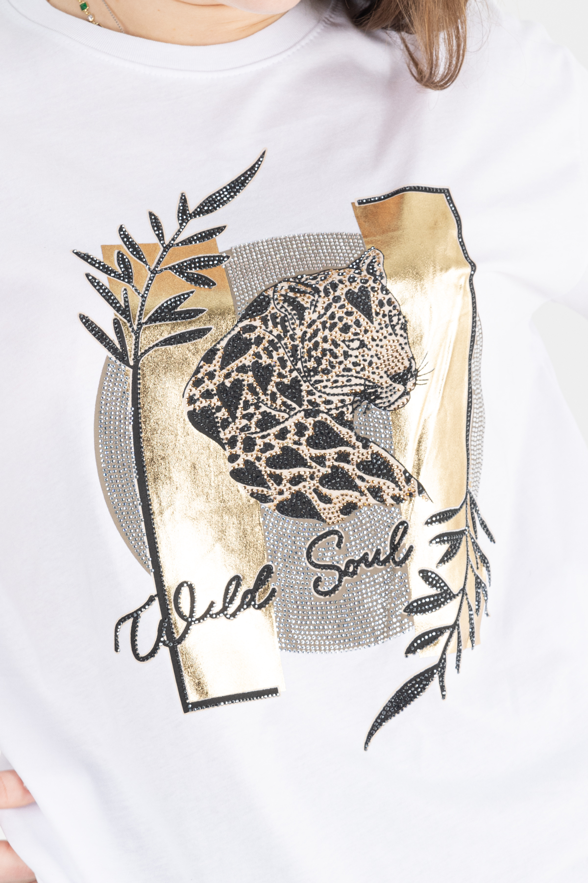 Beyaz zemin üzerine leopar desenli "Wild Soul" baskı